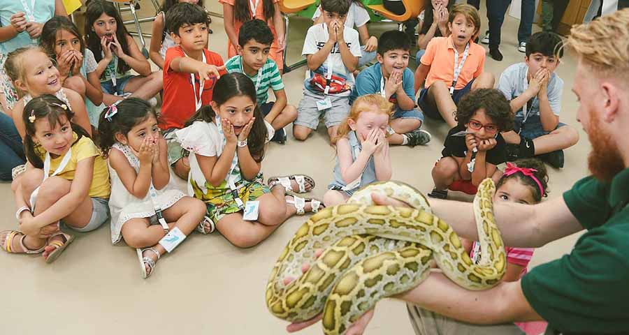Kids are surprised seeing a python at Dubai's Bio Dome Indoor Tropical Rainforest.
